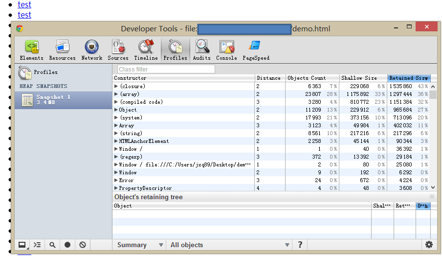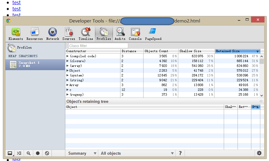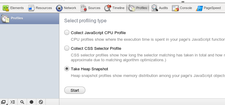 Profiles --> Take Heap Snapshot,用这个工具我们可以看到Javascript所占用的内存,能够对性能问题进行分析。
