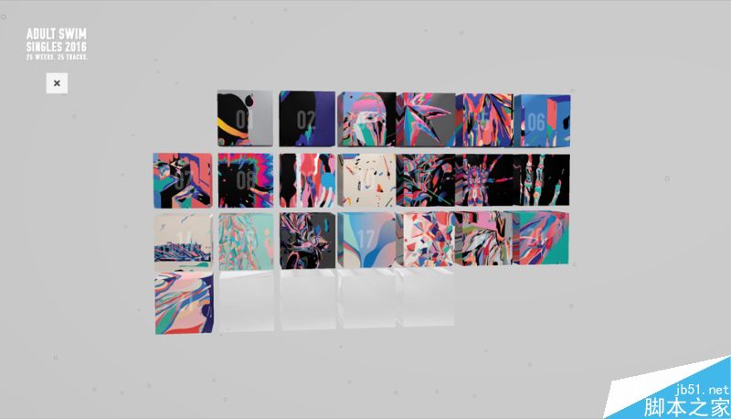 Adult Swim 网站的特点是移动缩略图的三维网格,其中有排版和颜色变化的悬停状态