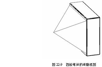 该长方体后侧面中心点与其前侧面的四条边可分别形成四个平面,使用"slice"命令,以这四个平面为剖分平面,将该长方体剖切为一个四棱锥体,其消隐视图如图22-9所示。