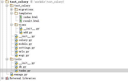 【说明】:tools是django包,和test_celery是同级目录,该包功能主要存放工具类函数和执行的任务;