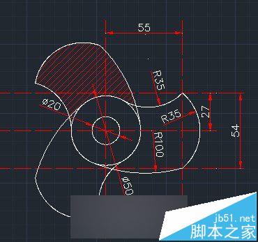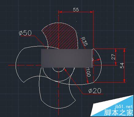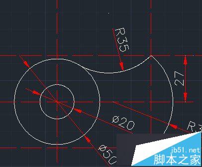 3.画扇叶边上的R35弧线。需要做两个辅助圆,半径分别为R35和R60。然后修剪即可。