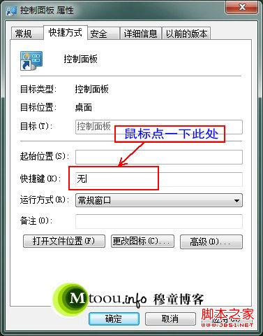 创建完后我们就可以在桌面上看到一个控制面板快捷方式了。然后我们按照以下操作:在这个快捷方式图标上点击鼠标选择:属性→快捷方式。然后鼠标点击快捷键(K)栏目后的“无”,如下图所示:
