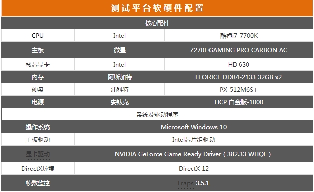 为保证测试能够发挥显卡的最佳性能,本次测试平台采用全新7代酷睿芯——Intel酷睿i7-7700K处理器、微星Z270芯片组主板、阿斯加特DDR4-2133 32GB双通道内存、安钛克1000w钛金电源组建而成。详细硬件规格如下表所示: