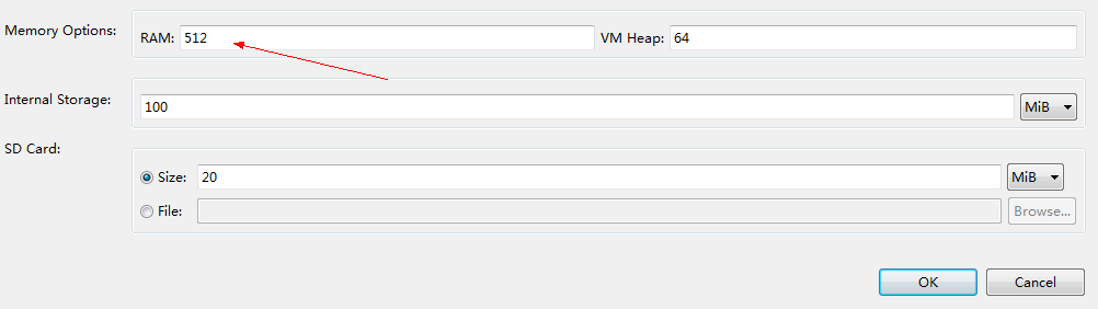 在AVD中(Android Virtual Device Manager)将模拟器的RAM调成512。