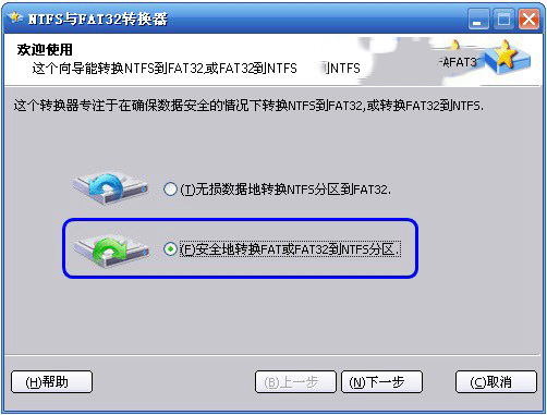 1、首先下载免费的“NTFS与FAT32转换器”,之后在向导界面中,选择是转换NTFS到FAT32,还是转换FAT或FAT32到NTFS分区,这里选择“安全地转换FAT或FAT32到NTFS分区”选项,如图: