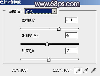 1、打开素材图片,创建色相/饱和度调整图层,对黄色,绿色进行调整,参数设置如图1,2,效果如图3。这一步适当降低图片中黄绿色饱和度。
