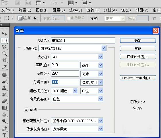 1、Crtl+N,如下图参数新建一张A4大小的画面作为教程示范: