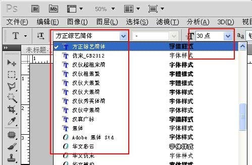 按T,在文字工具选项面板上单击字体列表框右侧的三角箭头,选择想要的字体,画布文字即变成相对的字体效果。
