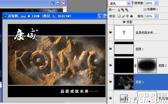 7、将去彩拖入,图层模式为滤色,注意图层顺序,和画布左侧贴齐。