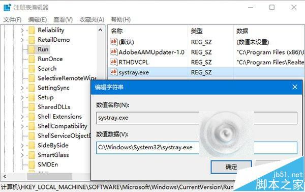 4、双击systray.exe键值,将其值修改为C:\Windows\System32\systray.exe,确定。