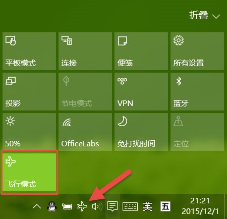 要将 Windows 10 切换到飞行模式最简单最为推荐的一种方式即是直接点击任务栏的通知图标,再点击最下面的飞行模式图标即可进行开关。