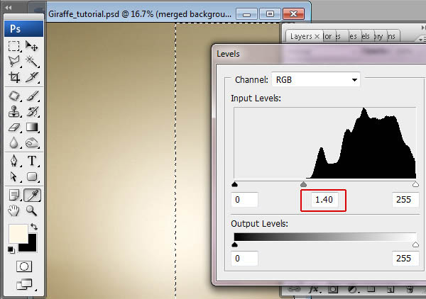 7、你将不得不选择屏幕上的小镜头区域。 菜单>“图像>调整”水平,将左边的灰色标记。 您可以添加,噪音小的影响,为创建的背景层。 进入菜单>“滤镜”>噪音>“添加杂色”。