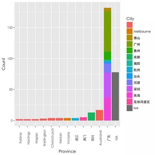看来我大部分的朋友都是在广东的(不是废话吗),其中广东的朋友大部分集中在广、深、珠,第二名是在奥克兰, 接着是四川、澳门等。灰色的 NA 值是指没有设置自己所在地的朋友,一共有 70 多人。