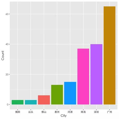 接着先根据省份、城市进行数据的分组和聚合,选择排名前二十的,利用 ggplot2 包画出如下的城市分布图(代码太长,不放了,就是这么任性,有需要参考的直接向我拿):