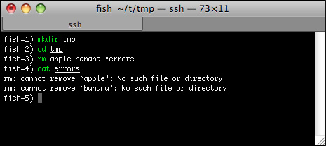 在命令 3 中,rm 产生的错误消息被重定向到 errors 文件中。命令 4 显示此文件的内容。fish shell 为重定向提供各种支持,比如把描述符组合成一个流和结束描述符。