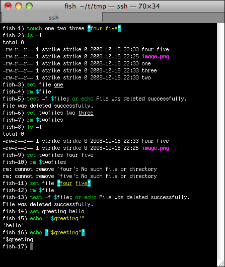 命令 11 和 12 演示空格规则。尽管在命令 12 中变量没有放在双引号中,但是 fish 在命令 11 中保留空格。非常好。