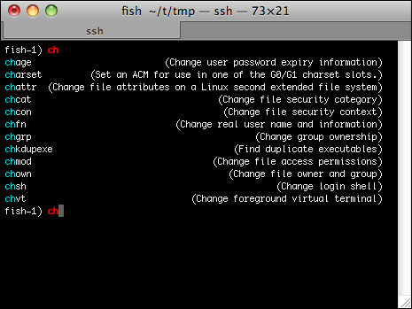 说到对用户友好,就不能不提到 fish 的制表符补全 特性,这个新颖的特性对于 UNIX 新用户和专家都极其有帮助。为了体验制表符补全,请按下面的示例操作。在每行的末尾按 Tab 键。