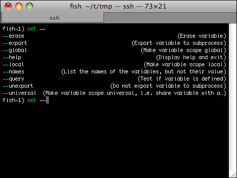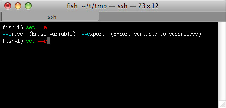 如果您不知道一个命令处理的操作数类型,fish 在许多情况下可以提供帮助,但并不是在所有情况下都可以。例如,如果输入 set(或 vared,即 fish 变量编辑器)和一个空格,然后按 Tab,fish 会显示可用变量的列表。set 的操作数是一个变量。同样,如果输入 type 和一个空格,然后按 Tab,fish 会显示内置函数的列表,这些函数扩展文件系统上可用的实用程序。