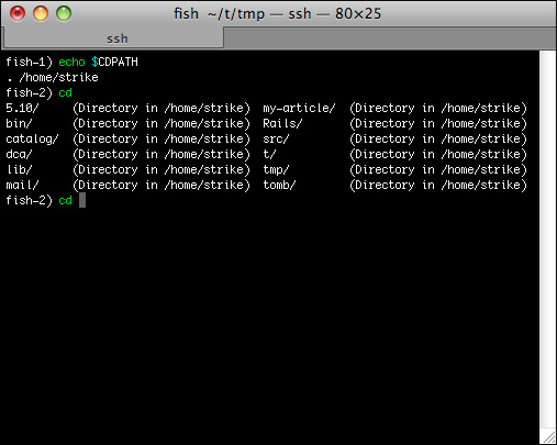 cd 函数是一个 fish 函数,它的操作数是一个现有的目录。在输入 cd 之后按 Tab,fish 会显示 CDPATH 中的每个目录包含的所有现有目录。