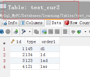 CREATE TABLE `test_cur1` ( `id` int(11) NOT NULL auto_increment, `type` char(11) default NULL, `order1` char(11) default NULL, PRIMARY KEY (`id`) ) INSERT INTO `test_cur1` VALUES (1, '145', 'd1'); INSERT INTO `test_cur1` VALUES (2, '134', '1d'); INSERT INTO `test_cur1` VALUES (3, '123', '1ad'); INSERT INTO `test_cur1` VALUES (4, '121', '1as'); CREATE TABLE `test_cur2` ( `id` int(11) NOT NULL auto_increment, `type` char(11) default NULL, `order1` char(11) default NULL, PRIMARY KEY (`id`) )