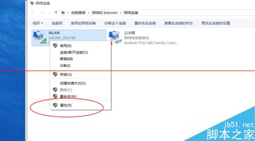 4、在wlan连接处右键单击属性