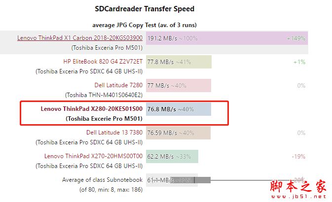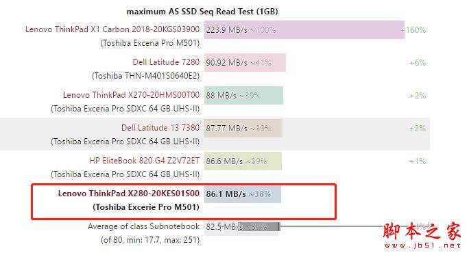 使用东芝Exceria Pro M501的测试结果只是平均水平,X1C 2018的读写速度要快上很多。