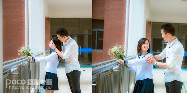 比起两个人正儿八经地站着,女生撩起裙子,男生一副欣赏的样子,也会让画面变的非常生动有趣。