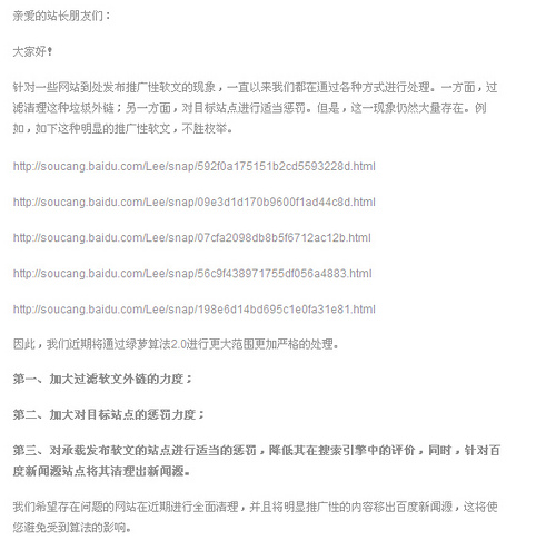 另外,关于外链的质量,可能直到现在,很多朋友都会把网站的权重当做是最重要因素,虽然知道外链要考虑相关度,但是在今天这样的大环境下,相关度的重要性在很多朋友眼中都是低于链接承载网站的权重的。今天百度绿萝2.0的公告,就是告诉你,不要只看平台的权重,宝宝树高不高?网易高不高?大型新闻源又怎么样?在百度眼中,新闻源只是比个人的草根站点稍微牛一点,但本质上都是一样要依赖百度。看你不爽一样惩罚!