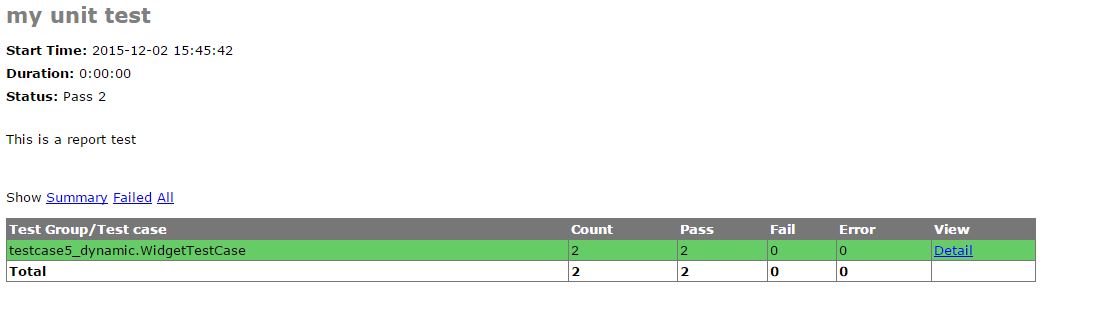#coding:utf-8 from lib import HTMLTestRunner import unittest from testcase5_dynamic import WidgetTestCase if __name__=='__main__': suite=unittest.makeSuite(WidgetTestCase) filename='D:\\myreport.html' fp=file(filename,'wb') runner=HTMLTestRunner.HTMLTestRunner(fp,title=u'my unit test',description=u'This is a report test') runner.run(suite)