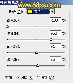 2、创建可选颜色调整图层,对黄色,绿色进行调整,参数及效果如下图。这一步主要把图片中的黄色转为橙红色。