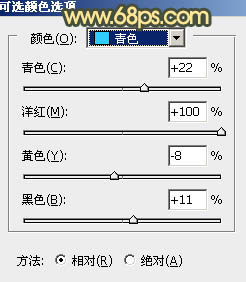 4、创建可选颜色调整图层,对黄、绿、青、蓝、中性、黑进行调整,参数设置如图12 - 17,效果如图18。这一步主要给图片中间调部分增加青蓝色。