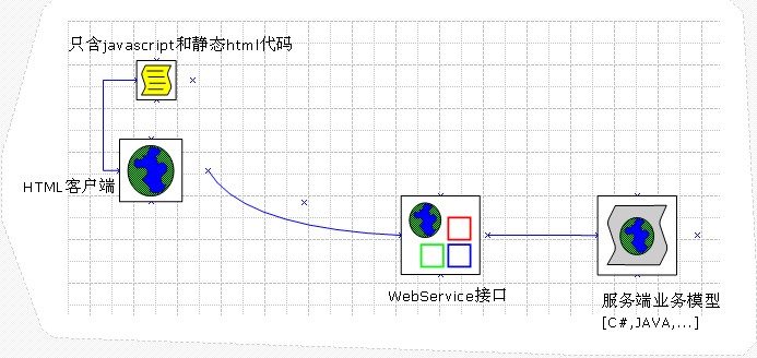 从上面的整体架构图,我们看出:其客户端都是WebService接口来获取数据和传送数据的,而服务端业务模型是什么语言开发的,完全不需要关注(当然在现实情况下,一般WebService接口最好同服务端业务模型是一个语言开发的)。