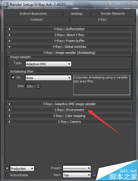 7、同样在渲染设置下面的环境参数我们也需要改,同样是改为纯白色。操作是直接按快捷键F10弹出渲染设置面板,找到V-Ray选项,找到下面的environment选项,将第一选项的on打上勾,将颜色块改为纯白。