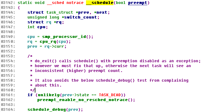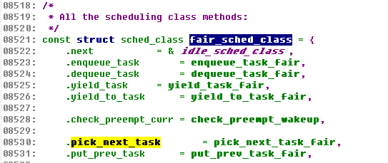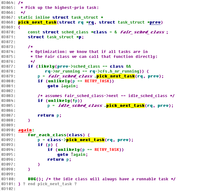 解读:先看下面的for循环,可以看到实现思路是,遍历每种类别,选择下一个可运行的任务。由于大部分任务都属于公平队列,所以,绝大部分情况下,都在公平队列中进行选择,所以,内核开发者在上面的代码中加了likely()提高性能。