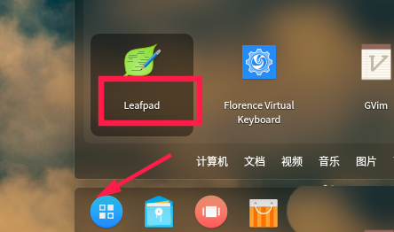 6、也可以点击“启动器”,在启动器运行leafpad