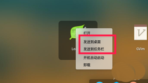 7、为了以后能方便打开leafpad,可以将其固定到任务栏或者发送到桌面,在启动器中找到leafpad,右键选择即可。