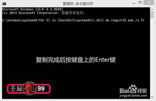 在打开的管理员命令窗口输入:for %1 in (%windir%\system32\*.dll) do regsvr32.exe /s %1 ;