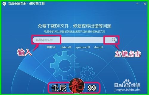在打开的百度电脑专家 - dll专修工具窗口的灰色框中输入丢失的dll文件名称,如:IEAdvpack.dll,再左键点击后面的搜索;