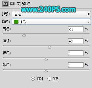 2、创建可选颜色调整图层,对黄色,绿色进行调整,参数及效果如下图。
