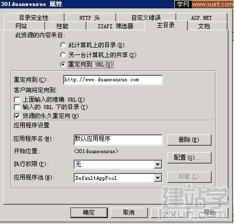 2.在IIS中选中刚才我们建立的站点,右键,属性,主目录,选择重定向到,输入网址如:http://www.xxxx.com,同时注意选中下面的资源的永久重定向选项。如下图: