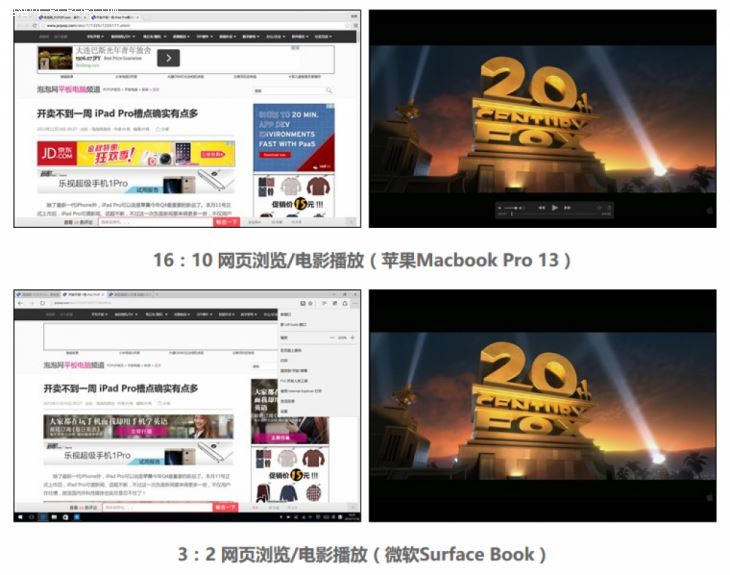 另外在屏幕比例方面,Surface Laptop 延续了 Surface 系列的 3:2,MacBook Pro 2016 则依然是 16:10,日常办公体验中 3:2 会更好一些,16:10 会更适合娱乐,但整体的体验不会有太明显的不同。