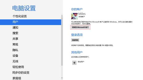 2) 在电脑设置页面,点击左侧“用户”,然后点击“切换到Microsoft账户”。