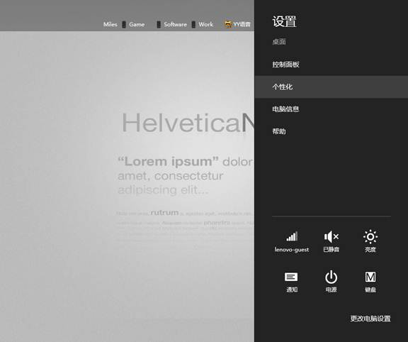与Windows 7的操作方式相同,大家可以在桌面右击鼠标,在菜单中选择“个性化”来进入个性化设置界面。此外,大家也可以将鼠标移至桌面的右上角或右下角呼出超级按钮栏,然后在“设置”选项中选择个性化选项。这是在Windows 8中特有的一个操作步骤。