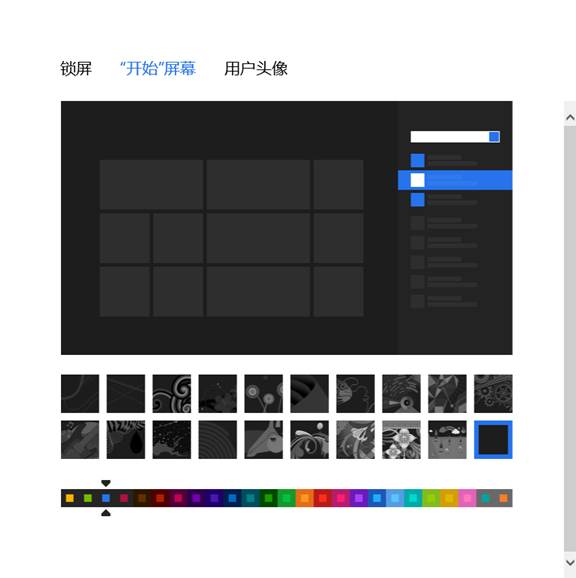 开始屏幕目前不能添加自定义背景,不过系统为用户提供了20种背景图案和25种颜色搭配方案,相信完全能够满足用户的要求了。至于用户头像这里就不多介绍了,只需将选好的图片添加进去就可以了。