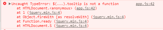 Uncaught TypeError: $(...).tooltip is not a function at HTMLDocument.<anonymous> (app.js:42) at l (jquery.min.js:4) at Object.fireWith [as resolveWith] (jquery.min.js:4) at Function.ready (jquery.min.js:4) at HTMLDocument.S (jquery.min.js:4)