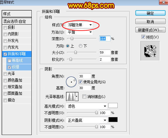 2、双击图层面板当前文字图层缩略图调出图层样式,然后设置参数如下图。
