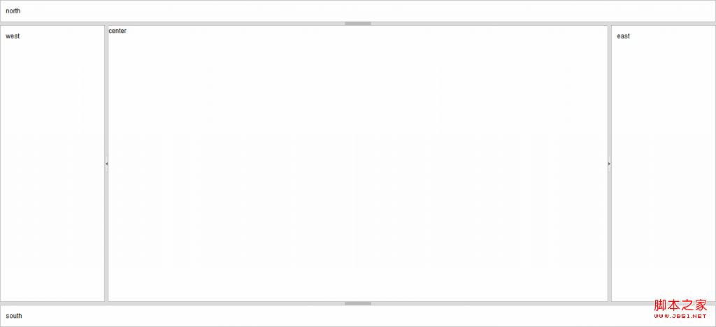 在本例中,布局容器是body,南、北面板是容器的直接子元素,南面板使用自定义类名“myclass-south”,需要在布局参数south__paneSelector中指定jQuery选择器;北面板使用默认类名“ui-layout-north”。东、西面板不是容器的直接子元素,需要指定id才能识别(不可以用类选择器),并且在布局参数“west__paneSelector”中指明对应的id。中心面板嵌套在form中,此时面板可以使用默认类名或自定义类名来识别。当一个面板满足下列两个条件时才可以使用自定义类选择器,否则只能用id选择器来识别:1、面板是form的直接子元素2、该form是容器的直接子元素,并且是容器中的第一个form。