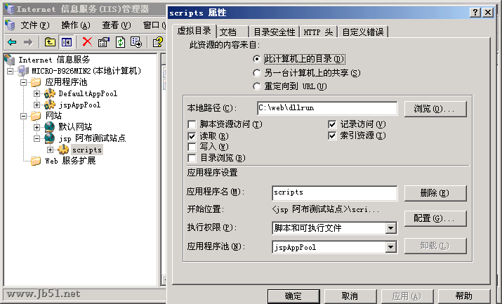 在jsp的网站上添加一个虚拟目录,目录名为scripts,并且给予可执行的权限。