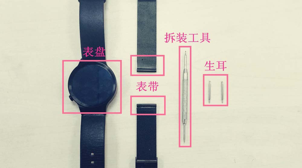 1、如图所示,全部元件分为"表盘""表带""拆装工具"和"生耳";生耳和表带属于一组元件,缺一不可!一般在购买表带时,生耳和拆装工具都是随表带赠送的!
