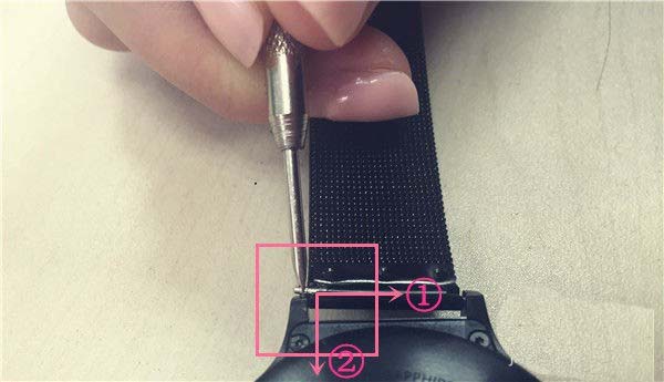 6、使用拆装工具顺着图示①将生耳推入空心圆筒,随后顺着图示②的方向将生耳推入表耳中,如果位置不对,就用手轻轻地调整位置,仔细听推进去的时候会有很清脆的"咔嚓"声;如果没听到声音,很有可能是表带卡住了生耳!